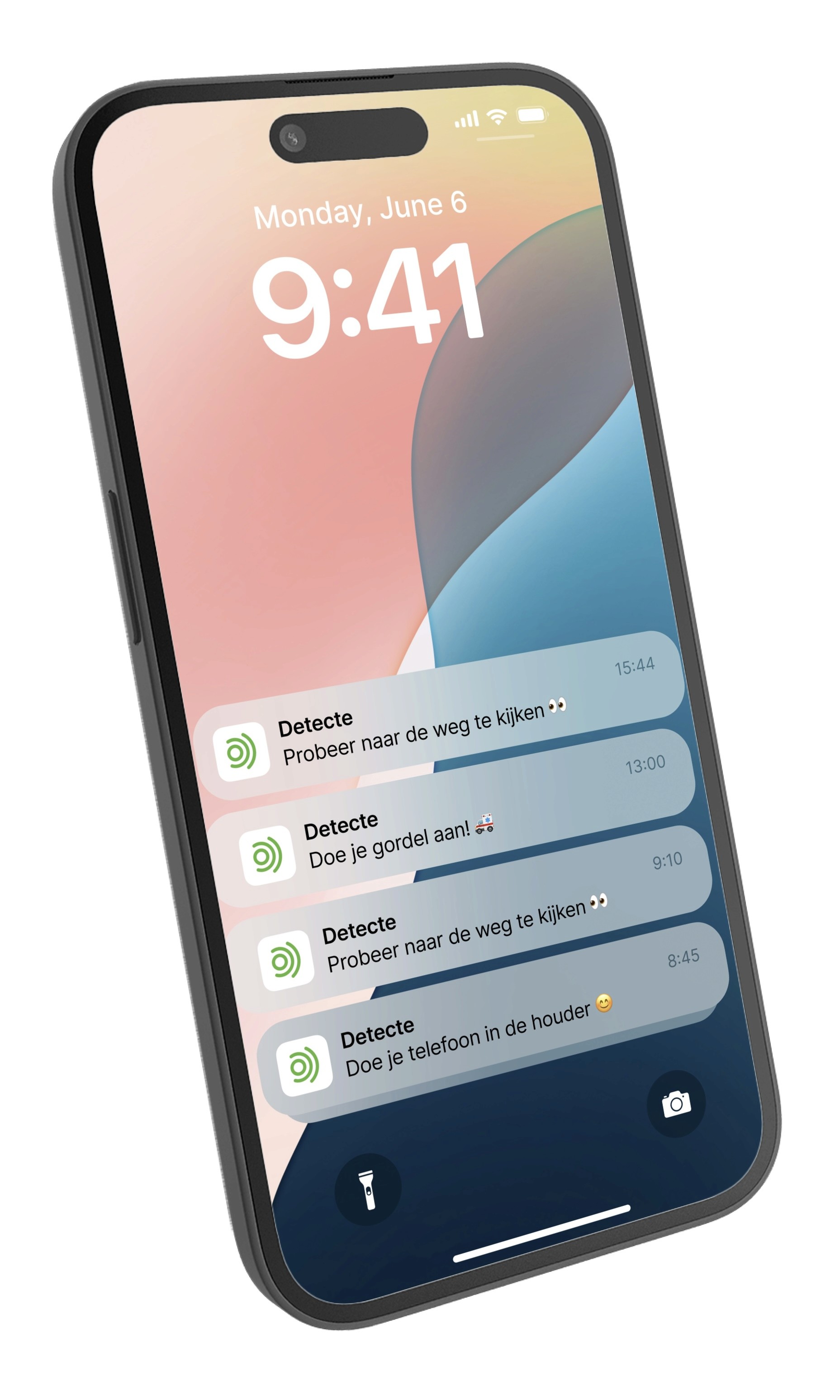 De app gebruikt de frontcamera om elke vorm van afleiding te herkennen: op het scherm kijken, wegkijken, slaperigheid en andere risicosignalen. Alles wordt lokaal op het toestel geanalyseerd, zonder extra hardware. Wie met een smartphone werkt, kan onze slimme houder gebruiken die enkel controleert of het toestel correct staat voor optimale detectie.